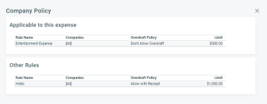 - On the Expense page, the rule that applies to the selected expense is separated out on the Organization Policy pop-up window.