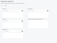 2. In the page, locate the field that describes the resource or resources you want to add, for example, Resources or Departments. Begin to type a name in the field and select from the list of options, or click the data selector icon and choose from the data selector options. Add recipients to each field as needed.