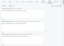 On the Contact Alerts tab, you can configure messages that will appear as alerts on several Autotask pages for the specific contact only.