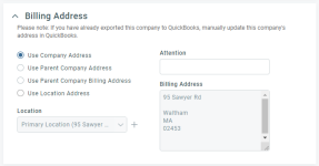 Use Location Address Select this option when you would like the invoice Billing Address to display the address of an organization location. Select the appropriate location from the data selector, or click + to add a new location.
