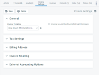 The Invoice Settings tab where you can customize billing settings for an individual organization appears on the accessory tabs of the Organization page. It displays the same fields as the Invoice Settings page associated with the organization. These settings will be used when you generate invoices using the batch invoicing process, and will be the defaults when you generate a single invoice. To open the page, use the path(s) in the Security and navigation section above.