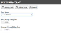 The Contract Hourly Billing Rate defaults to the standard view-only rate for the selected role. To modify the role for a time & materials, retainer, or fixed price contract, do the following: