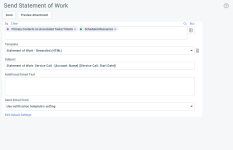 When you click Generate & Send on the New/Edit Service Call page or any Service Call list, the Send Statement of Work page opens. This page lets you generate the notification email the Statement of Work will be attached to.