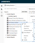 - From the LiveReports Designer main page, select a report and then right-click or use the context menu and select Schedule Report.