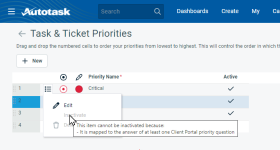 Autotask includes four basic priorities in the following colors: Critical: red; High: green; Medium: orange, and Low: dark gray. The default colors and icons can be edited.
