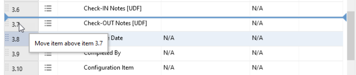 - Select a field row in the Order column and drag it to a different position in the desired section. A blue line indicates the new position of the field.