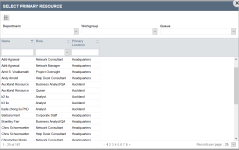 The selector window for primary and secondary resources allows you to select available resources not only by name but also based on their association with a specific department, workgroup, or queue.