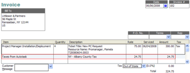 IMPORTANT  Do NOT calculate taxes in both Autotask and QB! If you have enabled Transfer Taxes Directly, we recommend that you disable the calculate Sales Tax feature in QB, or at least select a tax group that will not add taxes to the invoice (such as Out of State). Otherwise, your customers will be charged both the taxes calculated in Autotask and transferred to QB (where they appear as a line item), and the taxes QB calculates and adds to the invoice.