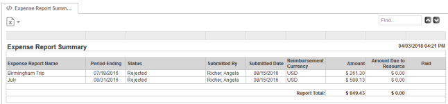 A list of submitted Expense Reports based on the selected criteria. The amount column in the report shows the total for the related Expense Report.