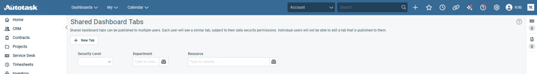 Below the New Tab button, three filters will allow you to view the list of shared dashboard tabs that have been published to a selected security level, department, or resource.