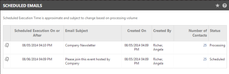 When the email is in the queue and waiting to be processed, it appears on the Scheduled Emails page. The list indicates the Scheduled Execution date, the Email Subject, the date the action was created (Created On) and who created it (Created By), the number of contacts that will receive the message, and the status (Scheduled or Processing).