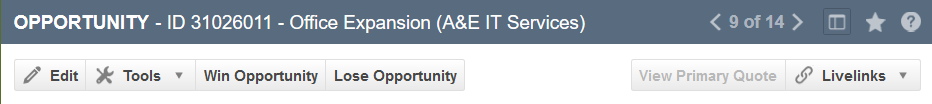 LiveLinks | Click to open the menu of all Opportunity LiveLinks published to the user. Click a LiveLink to launch it. Refer to LiveLinks. |