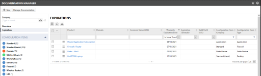 On the Expirations table of the Documentation Manager page, you can view all devices that have some sort of expiration date, including the following:
