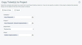 The Copy Ticket to Project feature allows users with access to the Autotask Projects module to copy tickets into a project; the basic ticket details become part of the project as a task. Time entries remain associated with the original ticket.