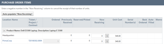 Click the Auto-populate "Now Receiving" button above the table to populate the Now Receiving column with the difference between Ordered and Previously Received quantities for all rows. NOTE If you selected items on the Receiving page and then clicked the Receive Full/Partial button to open the Receive/Cancel Receipt of Purchase Order page, the Auto-populate "Now Receiving" button will only populate the Now Receiving column for the items that you selected on the Receiving page. |