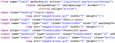 To find the parameter names this application uses, you can right-click the web site and select View Source from the sub-menu. The default text editor opens, displaying the source code for the page. Use the Find command and search for the text string <form. You will see something like this: