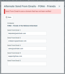2. Enter up to five Alternate Send From Emails addresses. All email addresses you enter here must be associated with a verified domain. Refer to Managing Domain Settings.