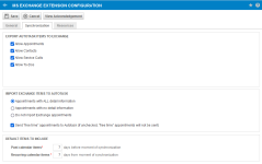 The Synchronization tab allows you to configure the types of calendar items that will be exported to and from MS Exchange, and the default number of past and future days to synchronize events for.