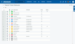 The order in which statuses appear on this page will control the order in which they appear in selector lists throughout Autotask. If you use the status field as a row or column in boards, statuses will appear in the order set here.