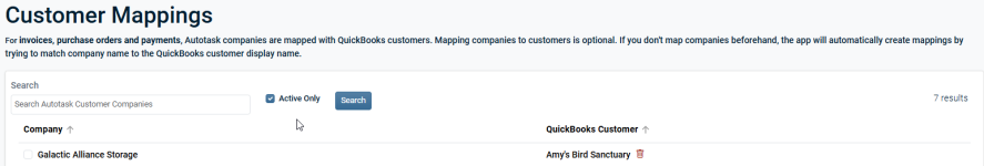 The Customer and Vendor mapping pages are dedicated to mapping Autotask organizations and vendors to QuickBooks Online. Customer mappings affect the syncing of invoices and payments. Vendor mappings affect the syncing of purchase orders.